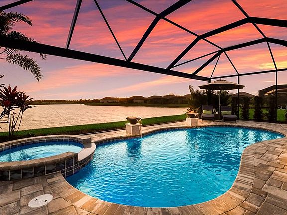 Breathtaking sunset over the lake and golf course command this idyllic three-bedroom plus den home in Lakewood National offering the epitome of Florida escapism. Built in 2019, the Isabella great room floor plan has already been enhanced by its current owners with statement white stone feature wall and fireplace in the great room, a resort-style pool/spa with fire bowls and sun deck, a Clearview lanai cage to absorb the stunning view, and even a remote controlled drop down sun screen. Exquisite living blends with the comfort and style throughout, boasting a sweeping single-level of tile flooring, tray ceilings, glass sliders, crown molding and energy efficient upgrades. The gourmet kitchen with stainless steel appliances, gas cooktop, wood cabinetry and large island with breakfast bar is optimally placed to enjoy your surroundings and stay connected to guests and family when cooking. Pull back triple sliders and experience the appeal of Florida living on your spacious lanai as you lounge, play and dine. The master suite allows for premium self-care with direct access to the lanai and the addition of custom walk-in closets that lead to a bathroom suite with soaking tub and separate vanity stations. The guest wing provides two additional bedrooms and full bath smartly positioned with a pocket door for privacy. The den offers versatility with a closet that can act as extra guest space, or the perfect office or fitness room. Programmable thermostats keep energy bills regulated, whole house water filtration system, and a two-car garage with epoxy flooring and additional ceiling mounted storage racks complete the picture. Lakewood National is the pinnacle of country club living with 36 holes of championship golf designed by Arnold Palmer and fantastic amenities, including fitness center with classes, tiki bar, tennis, events, walking trails, and so much more. OFFERS due 5pm Tuesday, March 9.
