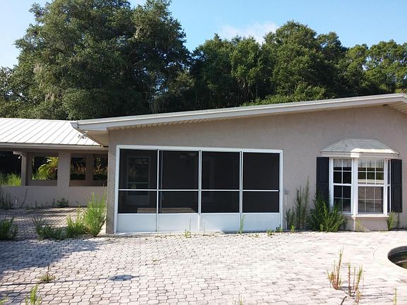 Looking for a home complimented by graceful oak trees on a tree lined road, here it is! Gourmet kitchen with solid surface counter tops, seamless double sinks, an abundance of chef drawers and cupboards, gleaming wood floors in kitchen and master bedroom, a formal fully carpeted living room with decorative columns and red brick fireplace. Family room with bay windows, French doors, views of the pool & paver pool deck and access doors to screened lanai for entertainment. Irrigation well, Detached 2 car garage w/covered work space in back & 2 car carport & extended driveway!