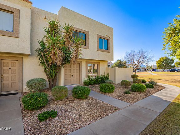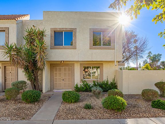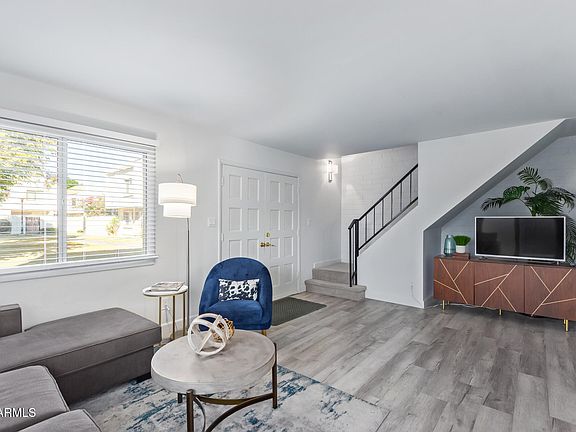 Stylishly updated end-unit with beautiful views of Camelback Mountain, ready for you! Enter through double doors into a fully furnished open space, featuring wood-look flooring and neutral tones. The spacious modern living room and dining provide plenty of room for entertaining, with a quaint half bath. The bright kitchen comes fully equipped with white appliances, granite counters and a tile backsplash. Upstairs, you'll find the sizable bedrooms and the full bathroom. Relax on the paver patio featuring convenient storage. Enjoy the community's amenities, featuring 2 pools and a spa. One of the pools just steps from the front door. Walking distance to Chaparral Lake, Scottsdale Greenbelt and dog park & a short drive to golfing and Old Town Scottsdale, with easy access to the 101!