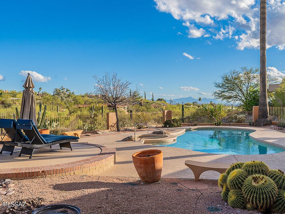 Fantastic 4 bedroom home in Skyline Bel Air Estates! Tremendous mountain views from this 1 acre hilltop property. Light, bright floorpan w/ formal dining room and a separate living room. Two of the bedrooms are large & en suite giving you 2 primary bedrooms. One primary bedroom newly remodeled and new vanities and toilets in the primary and guest baths. Exterior was just professionally painted, interior doors painted 1 year ago. New light fixtures, new refrigerator, new washer/dryer, new dishwasher, brand new AC replaced 2 years ago, new pool heater. Wood burning fireplace in the family room off of the kitchen. Backyard is a private retreat with a pool, mature palms privacy and quiet. Catalina Foothills School District.