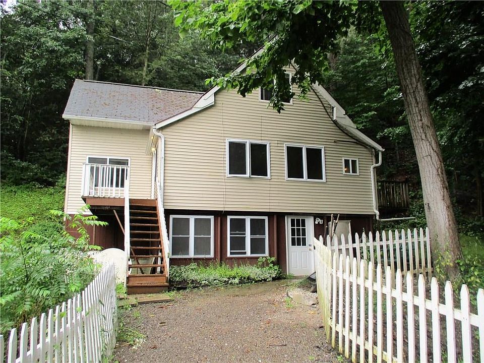 All the perks of waterfront living without the high taxes! An acre of land w/Right of Way to lake and ability to lease a dock and boat/hoist space (at low rate) for one boat every summer. Plumbing, electrical, furnace all redone 10 years ago. Walk out basement is full & ready for finishing with roughed in plumbing for another bath. Kitchen is super small, but it backs to a large dining area- think about knocking down wall and creating a large/ open eat in kitchen? The wooded lot is beautiful w/a little brook & waterfall. LOTS of parking available. Master bedroom is 14 x 20. Last deal fell through at 11th hour, all title and survey work done and ready to close fast. Currently occupied by month to month tenant who pays $995/mo.