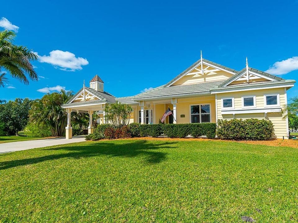 Key West style custom built residence within the gated community of Cypress Creek Estates in East Bradenton. Coastal inspired, tropically landscaped, portico to breezy front porch, double door entry into this bright, open plan living with tons of windows and wonderful sightlines from the front of the home to beyond the double French doors that lead to the expansive paver lanai with heated, salt 12 x 25 lap pool, incredible lake view and awesome sunsets. The main living area complete with gas fireplace surrounded by coral stone and 18" ceramic tile on the diagonal. A galley kitchen that is open to breakfast area with corner aquarium window on one end and formal dining room on the other, stainless appliances, tile back splash, plentiful countertops and cabinets ... great layout for entertaining. Split bedroom plan ... main bedroom has double French doors to lanai, two walk in closets, dual vanities, soaking tub, large walk in shower, linen cabinet and private water closet. Guest bedroom has it's own private bath with walk in shower and access to lanai. The den/office is the perfect work at home space or as an extra guest room with adjacent half bath. Additional features include 10 ft. ceilings, crown moulding, central vac and attic storage. Spend time relaxing in the gazebo or on your private fishing dock with brackish water complete with sink and electric. The 3-car extended garage has an extra 255 sq. ft. for a gym, hobby/workshop, storage, etc. with an oversized driveway. Cypress Creek Estates is a small enclave of about 80 custom built homes with no CDD fees. Convenient to I75 and close to all the amenities shopping, schools, parks and beautiful Anna Maria Island & Bradenton Beach.