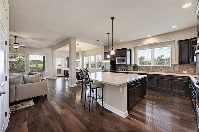 Stunning David Weekly home w/ open floor plan & huge kitchen island perfect for entertaining & family! Natural light floods into this home! Wood and tile floors throughout most of the home make it easy to enjoy. Huge master bedroom w/ seating area & the bedroom up front also has a full bathroom for guests or family. Enjoy a game room, bonus living space & beautiful covered porch. Located at the end of the culdesac next to a huge water pond! Community pool, gym, basketball, playing field and hiking trails!