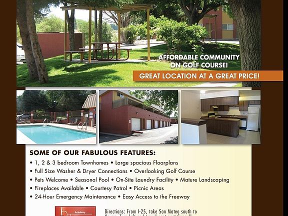 Chateau Apartments located in beautiful Albuquerque, New Mexico. We are in an excellent location near the Arroyo del Oso Golf Course and walking distance to restaurants, shopping, and entertainment. We offer one and two bedroom apartments and three bedroom townhome flooplans that are spacious and comfortable. The apartment and community amenities range from Air Conditioning, All Dogs Allowed, Broadband Internet Access, Cable or Satellite, Carpet, Cats Allowed, Courtyard, Dishwasher, Fireplace, Freeway Access, Furnished Available, Garages, Garbage Disposal, Internet Access, Laundry Facility, Patio or Balcony, Pets Allowed, Pool, Public Transportation, Short Term Lease, Small Dogs Allowed, View, Walk In Closets, Washer Dryer Hookup, and Window Covering and more! Call Chateau to schedule your personal tour today! 12