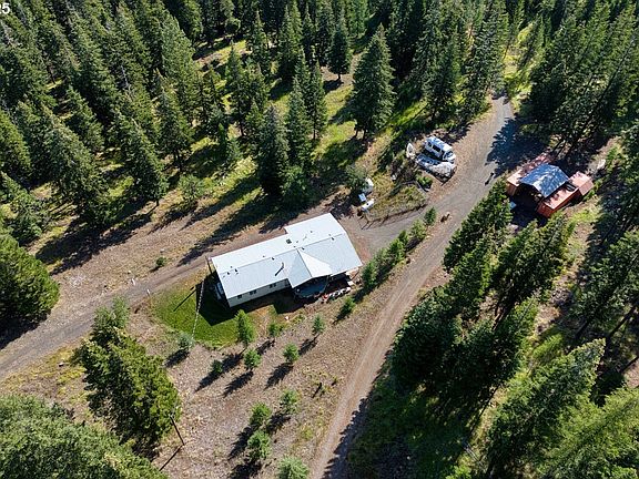 Nestled in the trees just outside of Joseph, this 8.55 acre property offers privacy and flexibility with access from both Old Ski Run Road and Chief Joseph Loop Road. The 3 bed, 2 bath split floor plan manufactured home features a spacious primary suite with a large attached bath. Open concept kitchen, dining and living area. Utility/laundry room with sink. All appliances included. RV storage area with hookups and power is framed by two storage container outbuildings. Enjoy Stanley Creek running through the property and the seasonal abundance of morel mushrooms from your backdoor. Domestic water provided by a shared community spring.