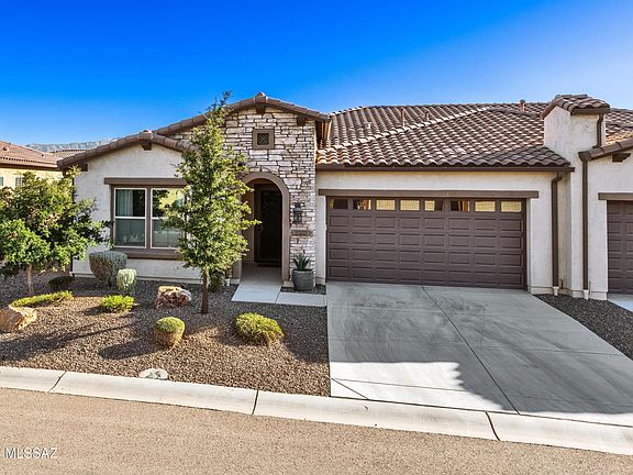 This beautifully upgraded Viva villa in Saddlebrooke Ranch is the perfect place to call home. You are greeted with a custom screen entry door and welcomed into the open kitchen/dining/ great room with modern lighting. The kitchen features a large island, stainless steel appliances, gas range, custom cabinets with pull-outs, a gorgeous backsplash, quartz countertops, and a walk-in pantry. The primary suite has dual sinks, a tiled shower and backsplash, generous linen closet, and a custom organization system. The split bedroom floor plan includes a guest bedroom with custom closet organization system and an upgraded bathroom with shower/tub. The home also has two-tone paint, flat panel doors, a laundry room with cabinets and a sink, extended 2-car garage with epoxy floor, and a water filtration system. The outdoor area features a partially covered courtyard with pavers and rolling shades for warmth in the winter and shade in the summer. The Villa HOA takes care of maintaining the exterior paint, roof, landscaping, and irrigation, as well as pest/termite control. Don't miss this opportunity for low-maintenance living in sunny Arizona!