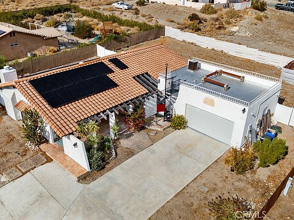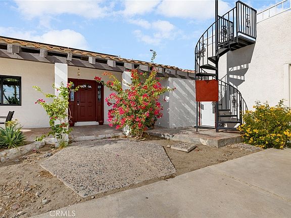 Welcome to the most romantic desert retreat! This stunning 3 bedroom, 3 bath home offers a non-traditional layout with the primary suite being a possible income producing option, located in the serene community of Whitewater with breathtaking 360 degree mountain views and solar. As you enter the covered porch you are greeted with Spanish Style Tile and lush vegetation and plenty of space to relax or entertain. The expansive property spans almost .36 acres and offers RV parking and plenty of space for all your toys! As you step inside to the charming living area you are greeted by vaulted wood-paneled ceilings, exposed beams, LVP and tile floors, large windows flooding the home with natural light, a cozy fireplace and French doors to the first exterior living space. Off the living room is a chef’s kitchen featuring all electric appliances including, brand new white paint, new sprayed countertops, an island bar, and a picture window overlooking the serene desert landscape. Just off the kitchen you'll find the first of two spacious rooms in the main part of the home and two full baths. One bath is appointed with a brand new modern vanity and newly glazed bathtub. The second bathroom is just down the hallway and has its own upgraded vanity and brand new glazed shower as well. This home also includes an attached casita which serves as the primary bedroom and if needed could be converted back to the main bedroom inside of the home. It is currently ideal as an income-producing room or a private sanctuary. The bedroom currently has its own entrance and private courtyard with the potential for cozy customization. The space is appointed with its own walk-in closet and attached bath featuring a single vanity and shower/tub combo. Outside of the primary bedroom is a spiral staircase to the above garage terrace with its sweeping mountain views. It is the perfect place to watch the sunrise or sunset over the beauty of the desert. The expansive lot is surrounded by the beauty of the desert and mountains, offering opportunities for outdoor living and relaxation. The home’s proximity to Palm Springs or Joshua Tree, each just a quick 20 minutes, adds to its appeal for those seeking a tranquil lifestyle with easy access to urban amenities and outdoor adventures. Don’t miss the chance to make this romantic mountain-view retreat your own! Whether you’re looking for a family home, an income-generating opportunity, or a quiet escape, this property has it all.
