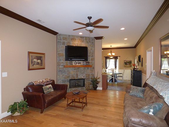 This warm and cozy home is convenient to shopping and the Interstate. Featuring a beautiful Stone Fire place, dark Crown molding. Eat-in-kitchen w/pantry and nice kitchen cabinets, tile backsplash. Solid doors throughout. Tiled bathroom floors. Engineered flooring. The Primary Bedroom has a walk-in-closet and a large soaker tub. Nice Utility room too. A two car garage with a fenced in backyard. Welcome Home! Drapes do not convey.
