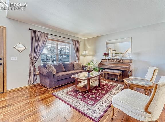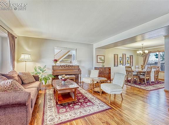 Welcome to the centrally located home of your dreams! This 2 story 4 bedroom, 3.5 baths and oversized 3 car garage sits high enough to capture Pikes Peak views! Beautifully maintained masterpiece. Loaded with luxurious extras from the beautiful hardwood floors that stretch throughout the main level living, dining and kitchen to the lush window treatments. A lovely living area greets guests and the adjacent formal dining room is richly designed. Your kitchen has granite countertop with island breakfast bar, pantry, large composite sink and all appliances. It's easy to entertain or gather as a family with the second main level living room open to the 2nd floor above. This living/family room is complete with fireplace, walkout, soaring ceiling, ceiling fan and decorators ledge. Don't miss the main level office - or use as a bedroom. Upstairs the spacious owner's retreat has Pikes Peak view, adjoining 5-piece bath, walk in closet, vaulted ceiling with fan. Two additional bedrooms, both with vaulted ceilings and fans, and a full bath in the hall complete the top floor. Don't miss another view of Pikes Peak as you head back downstairs glance out the large picture window in the stairwell. The finished basement adds the 4th bedroom, full bath and oversized living area makes the perfect indoor play space for all ages. For outdoor play the level grassy backyard is completely fenced in and boasts mature trees. Outdoor dining on the large patio makes for relaxing family outdoor fun and entertaining. Need garage space? Check! Your oversized 3 car garage has workbench and extra refrigerator remains. Home has sump pump, air ducts were cleaned 7/2020 and the HVAC system has received annual maintenance including 2/2021. Top it off with the central location and your dream home is waiting for you! Minutes from Air Force Academy, Library, Shopping, Schools, Downtown COS, Parks & Playgrounds, Restaurants and more!