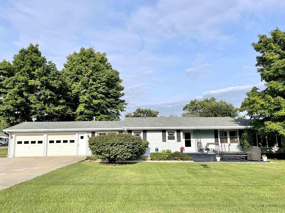 Well maintained & landscaped 3 bedroom, 1-1/2 bath ranch with an attached 2 car garage. Enjoy evenings on either front or back covered porches or around the wood burning fireplace in family room. Corner lot allows for two entrances to the house. Roof-2017 (1 layer). Insulation added at time new roof was placed. Microwave & Bath room fan vented thru roof. Tilt-in windows for easy cleaning except family room which are Anderson windows. Heated garage with rebuilt walls and ceiling, added insulation. Wired for a generator. Septic pumped 9/21. Well checked 7/21. Water softener power head and tank rebuilt in 2021 (like a brand new water softener). Whole house filter on water softener. Koorsen security system $320.62/yr. Gas-$67 budget. Elec $80-$120. Trash $87/3 mos. Spectrum $54/Mo. Crawl space-NW side of house by fence. Well/septic both in back yard. Sump pump in crawl under furnace area in house. Divided workshop - North half could be used as a garage, built-in work bench.