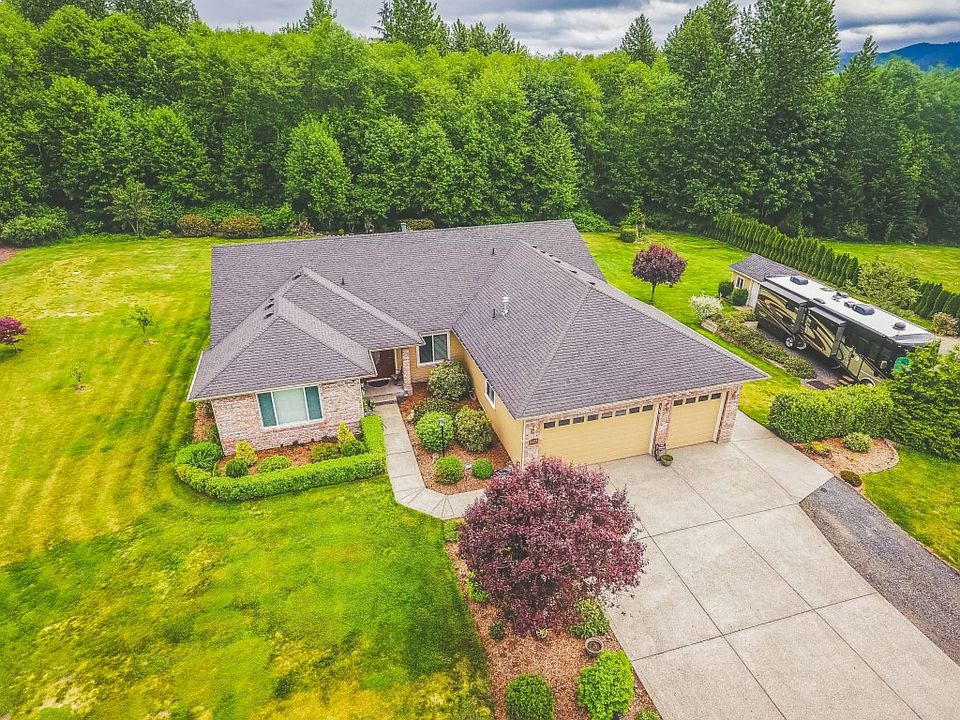 Welcome home to Arlington Highlands and this better than new 2500+ sq. ft. 4 bed, 2.5 bath rambler! This home boasts vaulted ceilings, hardwood floors, granite countertops, skylights, huge kitchen and enormous Master Bedroom suite. All appliance stay with the home. Newer paint and heatpump. Large level lot with firepit, backs to Native Growth Protection Area. Partially fenced for small pets. 12x16 garden shed w/roll up door. RV parking area with power for your RV. Easy access to Centennial Trail