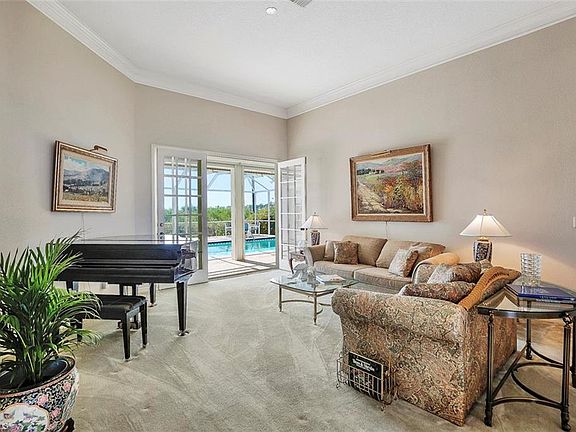 Price Drop $10,000! First Time on The Market! Grand 3 Bedroom, Plus Library Den. This is an Original, Custom Designed Home that Offers a Stately Presence from the Street! Inside the Double Door Entry, the Home Opens Up to 10' Ceilings and Crown Molding throughout. Both the Great Room (Family-Dining), and Master Suite Ceilings Vault to 21'. Romantic French Doors Compliment the Architectural Features and the Delft Blue Tile around the Family Room, Wood Burning Fireplace. All Rooms in the Home have 10' Ceilings and Crown Molding. The Den, with Built In Library, also could be used as a Bedroom, it does offer a Closet. Large Sparkling Pool with a Great Sunning Deck and Outdoor Kitchen. The Natural Lighting throughout the home is Exquisite. Spacious 2 Car Garage with Room for Storage. New A/C! Whole house Hurricane Protection. Be sure and view the Aerial Video! The Forest Country Club Membership is Optional. The Forest Country Club Community is located in the Heart of South Fort Myers, with RSW Airport just 15 min away, Beaches, Restaurants and Shopping Nearby! Low HOA fee, 1163.00 a year for a Gated Community! Come Live & Play In The Forest!