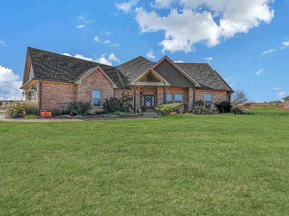 Beautiful curb appeal. Total quality custom built one owner home. Approximately 1 acre land. 4 bedrooms, 4th bedroom have double French door can be a study, side entry garage, 30x50 insulated metal workshop on concrete floor with overhead door & electric covered front porch. External covered patio. Open floor plan, step in to wide Foye, large living area. Corner fireplace. High ceilings throughout, chef's dream kitchen. Extra long breakfast bar. Abundant of beautiful custom cabinets & counter spaces, large walk in pantry. Stainless steel appliances. Large dining area. Secluded primary bedroom w/designer high ceiling. Doors to covered patio. Luxury bath have wide double door whirlpool tub & separate tiled shower, 2 separate vanity, huge walk in closet w/built ins, wood privacy fenced in yard sprinkler system in front yard. Roof & fence. New 2025, call 580-248-8800 for showing or text 580-581-7870 for more details.