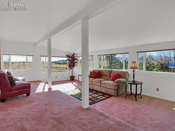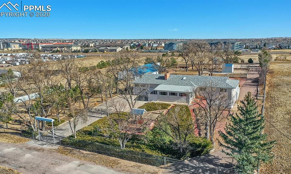 Spectacular Mountain View on primo setting! This well-maintained home on a private road with nearly five acres is what you've been looking for! A piece of the country, situated closed to Powers and Dublin Boulevards. Lots of living space, huge kitchen, bright and private sun room, good-sized, tall garage, all on two levels (main level and basement). Great western views! Basement with separate kitchen could be separate apartment. Current owners heat the whole house with the basement wood stove! Great outbuildings for storage or recreation. The huge shop is perfect for a hobbyist or craftsman or tradesperson; it has 1/2 bath, is insulated and has two garage doors. Plus shed and playhouse! Zoned for animals (buyer must verify with zoning / El Paso County. Great opportunity to invest in location, and make this home yours. Don't wait on it!
