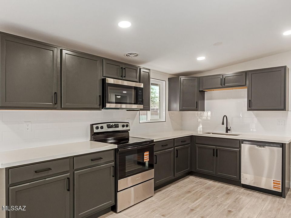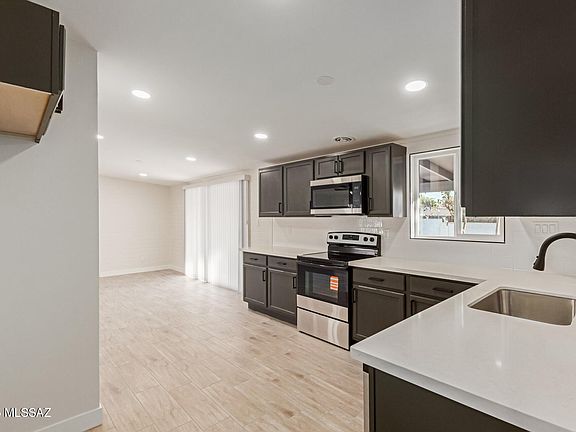 Home, sweet home! This charming single-level gem is ready to impress! Inside, you'll find wood-look floors, vaulted ceilings, and a cozy living room perfect for relaxing nights in. Close to a wide variety of Tucson foodie restaurants, prime shopping and local parks, close to Davis Monthan Air Force base and local amenities. The kitchen shines with stainless steel appliances, neutral cabinets, a stylish tile backsplash, and sleek counters. Each bedroom promises sweet dreams, while the main bedroom delights with its chic bath. Out back, enjoy a covered patio, handy shed, and plenty of space to design your dream oasis and even a pool! Minutes away from shopping spots, schools, and other local amenities. Your next chapter starts right here!