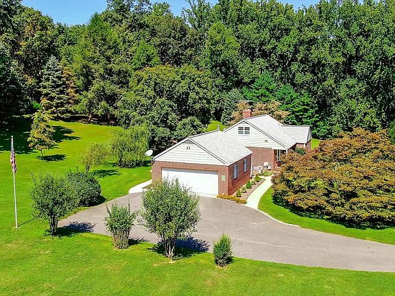 Absolutely stunning setting for this well cared for home sitting on a breathtaking tree lined three acre lot. Enter into the slate foyer & spacious living room w/hardwood under carpet. The primary bedroom is on the main level with dual entry bath, & there are two additional freshly painted bedrooms w/ HW floors on the upper level. The tastefully updated eat-in kitchen w/breakfast bar provides plenty of cabinet & counter space, and flows easily into the main level family room w/fireplace & floor to ceiling windows to gaze out to your gorgeous grounds, w/sliders for easy access to patio. There is an enclosed breezeway between the kitchen & garage to sit & soak in the sun while enjoying your morning coffee. Convenient laundry room on the main level along w/full bath. The huge basement includes a second kitchen, recreation room, two utility rooms & another full bath. All this plus the most gorgeous lot surrounded by mature trees & nature, complete w/a two bay out building to store all your yard & gardening tools Your own private Oasis! See it before it's gone.