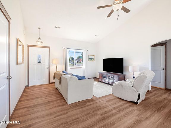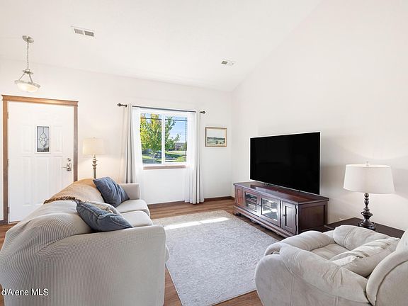 Welcome to this charming home in the beautiful city of Rathdrum! Located on a desirable corner lot, this single-level home boasts a thoughtfully designed layout, offering privacy with the primary suite situated on one side and the guest bedrooms on the other. Enjoy stunning mountain views right from your doorstep, and take advantage of nearby Majestic park and walking trails. Step inside to discover a spacious living area adorned with new luxury vinyl plank flooring, wood burning stove, and vaulted ceilings, creating a warm and inviting atmosphere. The kitchen comes complete with included stainless steel appliances, making it perfect for entertaining or cozy family meals.