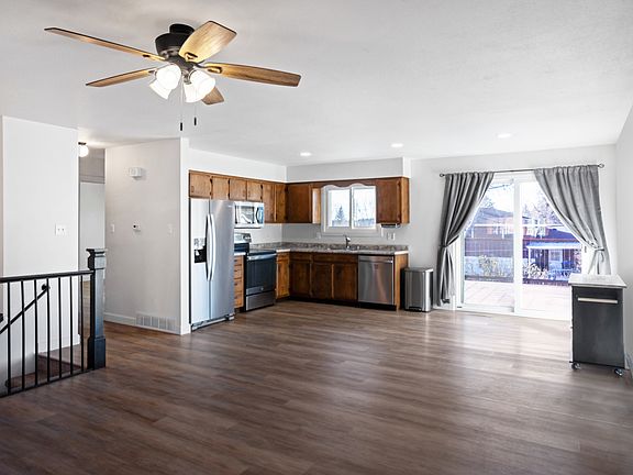This four-bedroom, two-bathroom split-level home has a recently renovated open kitchen, dining, and living area, updated bathrooms, new windows and shades, fresh paint, new luxury vinyl tile flooring, new refrigerator with ice/water dispenser, new microwave and dishwasher, downstairs living area with a new gas fireplace, new patio doors and backyard Trex deck. Two large bedrooms and bathrooms upstairs and downstairs. 2 car attached garage, a fenced back yard, and plenty of storage. Washer, dryer, and freezer are included. It has a great location in North Cheyenne near Coyote Ridge Elementary School, Frontier Mall, and FE Warren Air Force Base. Flexible lease lengths are available. Security deposit is $2,150, and rent is $2,150 per month. Utilities are not included. No smoking. No pets. Flexible lease lengths are available. Security deposit is $2,150, and rent is $2,150 per month. Rent and security deposit is due upon signing. All utilities in tenant's name and paid by tenant. The landlord provides driveway snow removal and front and back lawn care. No smoking. No pets. Background check and renter's insurance is required. Property Manager is a licensed real estate agent in CO. Applications are valid for 90 days and the application fee is non-refundable.