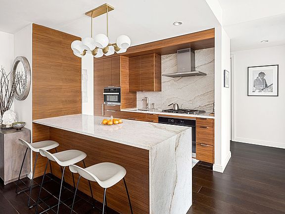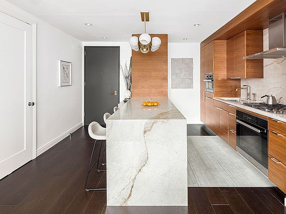 The west-facing primary suite features a custom-built dressing area and an en-suite bathroom with radiant heated floors, a double marble vanity, a steam shower, and a full-height linen closet. The second bedroom includes a spacious closet and is adjacent to a well-appointed second bathroom with floor-to-ceiling stonework, a marble-clad soaking tub, and elegant stone flooring. Additional conveniences include an in-unit washer and dryer, a versatile storage closet, central HVAC with Nest thermostat control and storage unit available for purchase.