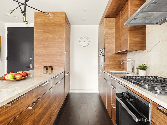 The second bedroom is also spacious with another deep closet, while the second bathroom features stonework from floor to ceiling in an ocean spray limestone, as well as a large deep soaking tub and stone floors. Both bedrooms have western-exposure through their floor-to-ceiling windows. An in-unit washer and dryer is discreetly tucked into a hall closet. Throughout the apartment you’ll find lovely wide-plank oak flooring and high ceilings. Unit 5C also comes with a private storage unit.