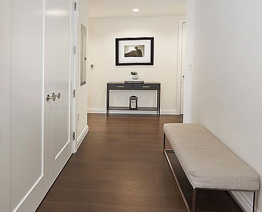 Upon entering, a generous foyer with a substantial built out coat closet gives a glimpse of the scale and proportions of the apartment. The large open plan living room and dining area provide plenty of space for relaxing and entertaining.