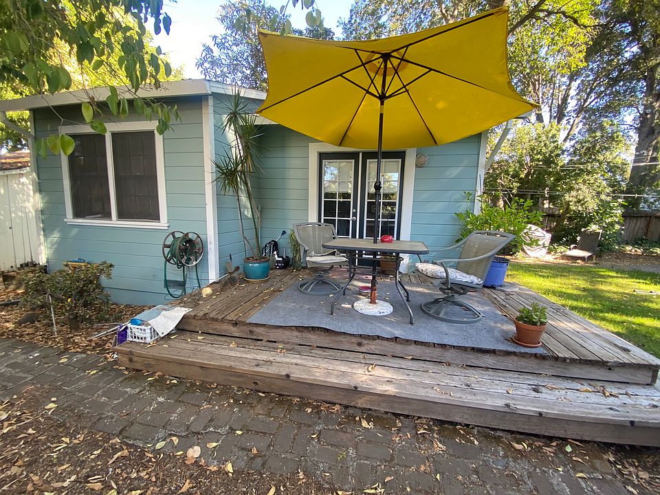 Open House: Saturday, November 9 from 2pm-4pm. This one bedroom, one bath cottage in the Santa Rosa Junior College neighborhood has opened up for rent. A great opportunity for a solo person looking for walkable living near downtown, with shared and private outdoor spaces. The cottage has a small bedroom with new carpet, tile floors in living spaces, a small but full kitchen with an apartment sized fridge and stove, and a living room with french doors onto a deck. Rent of $1650 includes exclusive access to a locked studio/storage space in the garage. The cottage has no closets itself. The cottage is behind a duplex with one long-term tenant and a newer tenant, a couple who put a lot of love into the yard and garden. All three units share the backyard and other outdoor spaces plus a laundry room (included, not coin-op). There is already one small dog on the property, but one indoor-only cat would be considered with an additional deposit. One year lease. Shared, coin-free laundry. Street parking. Owner pays water and garbage. For PG&E, the cottage is on the same account as the shared laundry, so Landlord will pay the first $25 each month and the tenant pays the remainder.