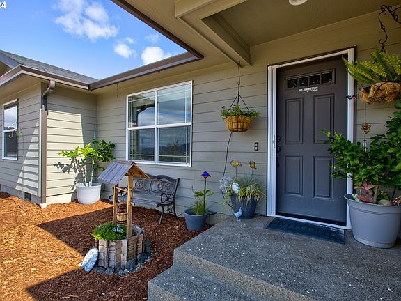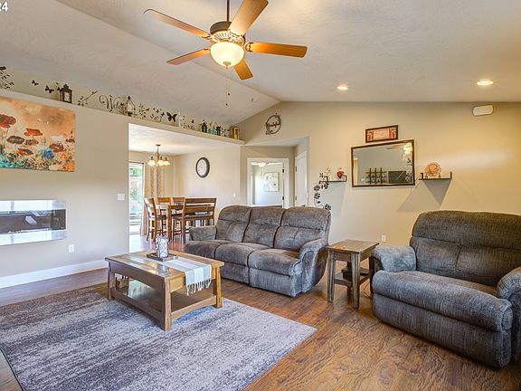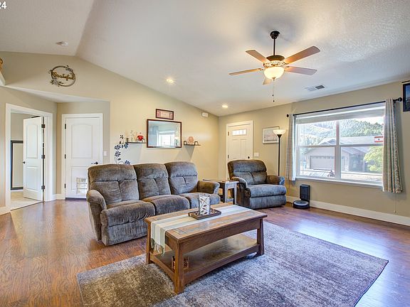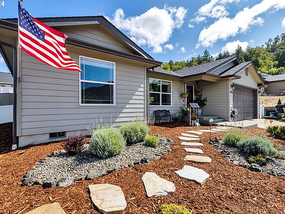 Welcome to 613 Brooks Loops in Sutherlin, OR! This comfortable 3-bedroom, 2-bathroom offers a blend of modern amenities and spacious living with a vaulted ceiling. The great room with vaulted ceiling, creates an open and airy atmosphere. The kitchen is a chef's delight with granite countertops and stainless steel appliances. Enjoy meals in the dining room, which opens to a spacious exposed aggregate patio—perfect for outdoor entertaining. The split bedroom floor plan ensures privacy for the primary suite, which is a serene retreat. The home boasts a combination of laminate flooring in the living areas, tiled flooring in the bathrooms and utility room, and cozy carpeting in the bedrooms. Additional features include a roomy garage, a beautifully manicured front and back yard, and central heating and air conditioning for year-round comfort. Be sure to check out the freshly updated backyard with expanded patio areas with covered area and terraced landscaping creating a cozy and private outdoor space.