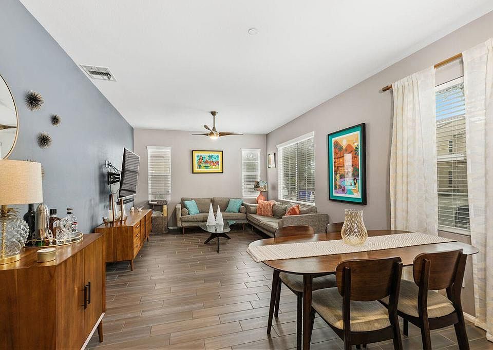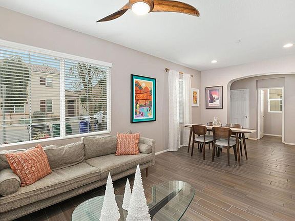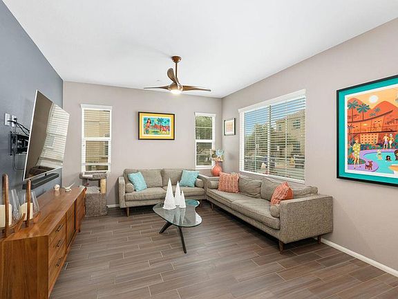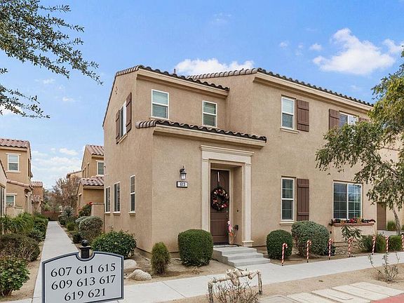 An inviting opportunity in Spanish Walk, this detached, end unit home produces welcoming warmth in a thoughtful flowing style sure to appeal to all. Upgraded tile floors, rich dark cabinetry and warm color tones complete the bright and cheerful living space with a convenient powder room adjacent. Gathering is encouraged in the Eat in kitchen finished with a large pantry, granite counters, stunning dark cabinets and stainless appliances. Three generous bedrooms upstairs with one en suite and another shared bathroom, large closets, storage throughout and a large second-floor laundry room round out this quiet, delightful upper floor. Centered in the middle of the Coachella Valley, Spanish Walk is a wonderful, gated community with 3 pools and spas, upgraded fitness center, green space and well-maintained grounds and sidewalks throughout for leisurely strolls in this charming community. Enjoy this low maintenance Spanish Walk lifestyle home!