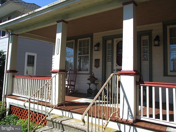 Classic Victorian style, full front wooden porch and rear raised patio, well schrubbed and landscaped lot, shared driveway which "V's" off to each yard. There is a large detached storage building at the property's rear. Formal Living room, all natural wood trim throughout, decorative fireplace, full and spacious Dining room, beveled glass door leads into the country kitchen with all the amenities, plenty of cabinets and counters, D/W, double sinks, stone flooring a Butler's pantry, a mud room with 1/2 bath and exit to rear patio and yard. Three second floor bedrooms and a redone hall bath with pedestal sink and claw tub with shower. There is a full basement (not finished, but painted and clean) and houses the heating systems and laundry facilities as well as a workshop, with Bilko doors leading out