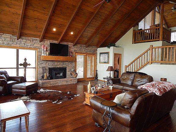Mountain elegance at it's finest with this 2549sf custom home on 1.30AC! Meticulously maintained 3BDRM/4BA/5CG has it all with RV garage with hook-ups, Vaulted tongue-in-groove ceilings, two fireplaces, hardwood flooring, metal roof, large fenced backyard with playhouse, circular driveway for easy access and so much more! Kitchen is open to the dining area with pantry, gas stove, refrigerator, dumb waiter and access door to back covered deck. Laundry room is off the kitchen with sink, cabinets and washer & dryer. Masssive living room has a wood burning fireplace and a pellet stove. Stairs lead to two bedrooms and full guest bathroom. Master bedroom is a sanctuary with access to covered deck, huge double vanities, large soaking tub with two shower heads. This home is exquisite! RV garage