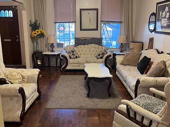 Location, Location, Location!!! City living with H Street Corridor and Union Market surrounding this row house situated with in a gated fence entrance to the front yard and screened in porch ideal for relaxing, enjoying the scenery and having a light meal, morning. noon or night. Cute foyer which introduces you to hardwood floors thruout the spacious living room, roomy dining room with pillars and kitchen with stainless steel appliances. Both dining room and kitchen open to sunlit exposed brick sunroom. Sunroom uses sliding glass door to deck where you oversee large gated backyard with two sheds and ample parking for 3-4 cars. The upper level has the expansive primary bedroom and 2 closets, 2nd bedroom and full bath with jacuzzi tub. The lower is inclusive of a rec room, bedroom/office. full bath, front and rear entrances and exits. "AS IS"