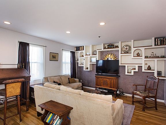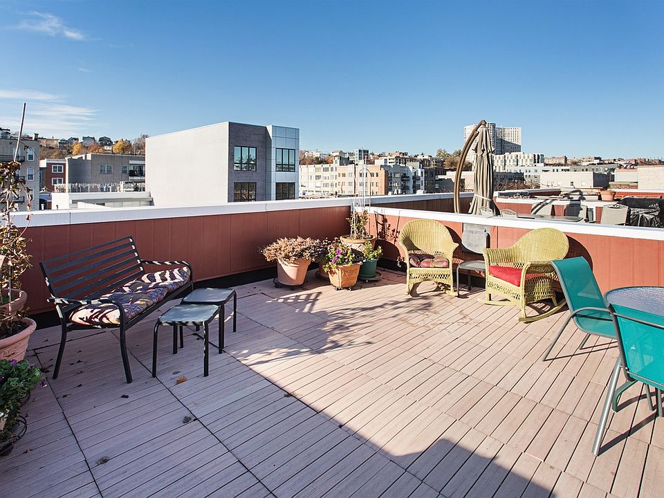 Well laid out 2 bedroom triplex located in midtown Hoboken. The first floor offers a spacious living room, a formal dining area, & adjoining kitchen featuring quartz counters & stainless steel appliances. The second floor offers 2 bedrooms (both fit queen beds), 1.5 bathrooms that were both completely gut renovated, & a washer/dryer. The third floor features an area that would be ideal for a home office or den, which opens out to a private 440 SF roof deck boasting NYC and sunset views. (Note: Some neighbors with similar units have built an additional living area on their roof deck, which would increase the total SF to ~1,700 SF). Condo offers hardwood floors throughout, two on-site deeded parking spaces (1 garage & 1 uncovered), additional storage, a tankless water heater, & a small common yard/outdoor area. Just a 5 min walk to Washington St, the NYC bus, & other local restaurants & shops.