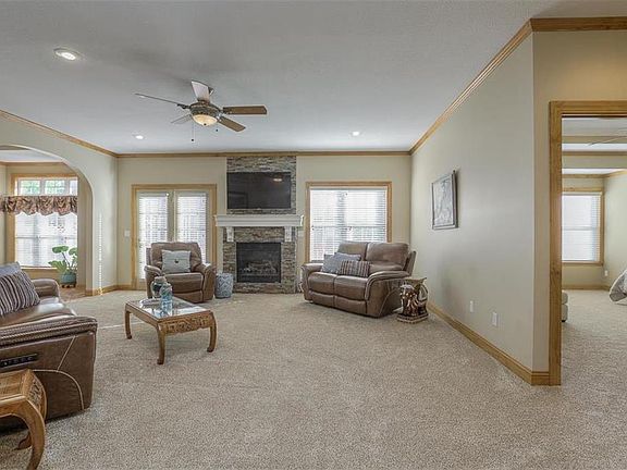 STUNNING ranch home in a GORGEOUS community!Move right in!Large entry w/high ceilings greets you at the door, open to a huge Great Room w/stacked stone FP.Huge kitchen with lg island w/cooktop,offers plenty of room for pizza night!Fml Dining/office too,w/deck overlooking walking trail. Master Suite w/soaring ceilings, huge bath w/double vanity,whrlpl tub, and walk-in closet. Add'l guest rooms share Jack/Jill bath. Full basement is SUPER CLEAN w/3rd FULL bath,great for future RecRoom area! Great for storage now!