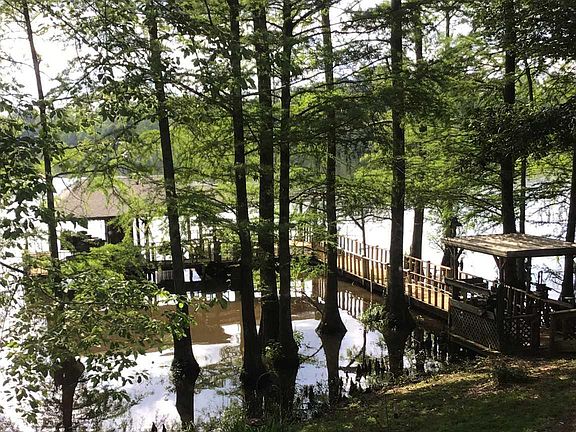 Lovely 3 bedroom 2 bath lake home with split floor plan located on 2 shaded lots with 213 feet on Water with beautiful nature-laden Cypress Trees, lush greenery and landscaping foliage, for excellent white perch, brim, and bass fishing! Large pier and nice double sized boathouse to boot with covered sitting area for fabulous sun set views and room for swings and patio furniture to enjoy grilling out on the water! This energy efficient home features a wood burning fireplace in the living room. 10 ft ceilings in the sunken living room, formal dining, master bedroom and master bath, Lovely oak pergot flooring in Living and dining, Nice storage closets, and built-in cabinetry throughout with lovely china hutch and bay window in the dining room. Roof is noted to be 4 years old, and sewer system recently updated. Large den /Sunroom for full full of the lake to enjoy daily!!