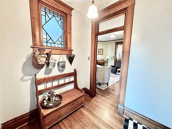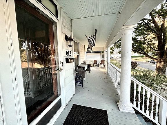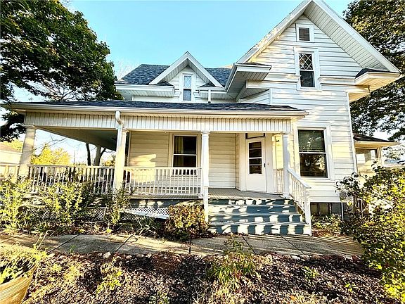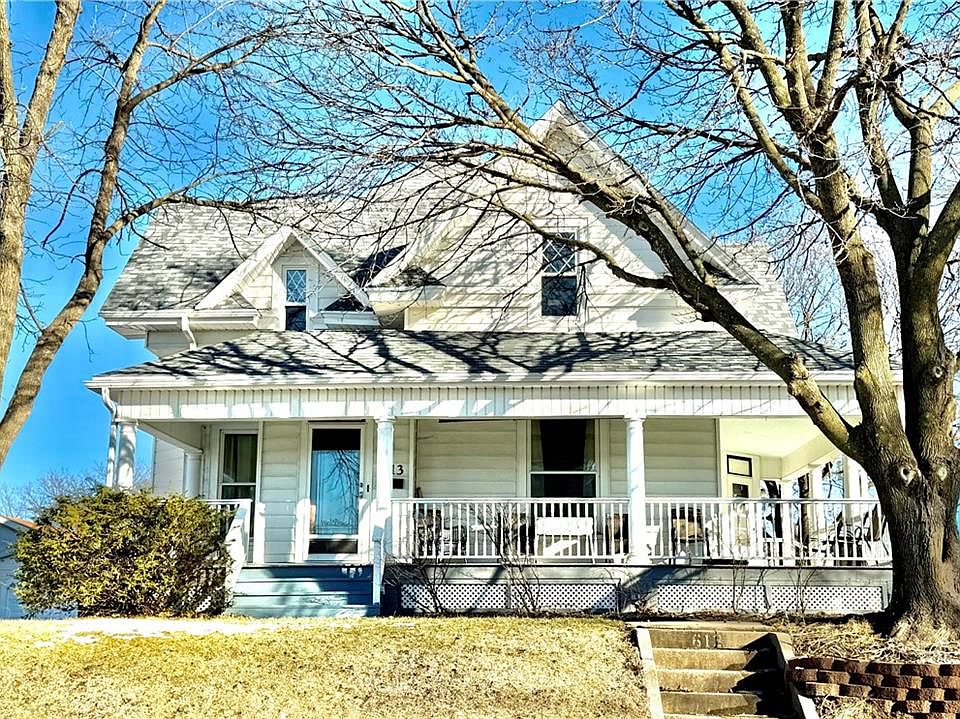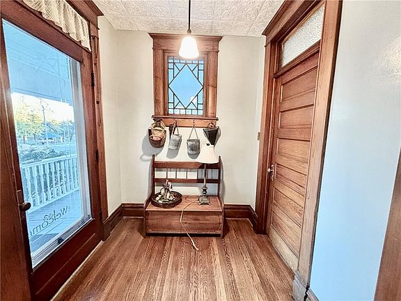 Experience the timeless beauty of this three bedroom, one and a half bath home. Boasting classic architectural details like wrap around porch, hardwood floors, and intricate woodwork throughout, while offering modern updates for comfortable living. Kitchen has custom cabinets with updated appliances, countertops, and pantry. Main floor has additional living room, family room, dining room, all oversized and many have original pocket doors and working window transits. Stairways has large landing with open rail that creates one-of-kind charm. All three bedrooms and remolded bathroom are located on the second level. Large closet in each bedroom with vaulted ceilings. Windows have been replaced and help make this an easy to maintain home. Fenced in back yard, covered patio, and detached two car garage are just a few of the main bonuses of this property. Do not miss the chance to own this historic home.