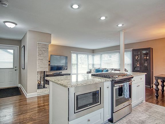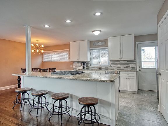 Welcome home! This home has an open floor plan with an awesome gourmet kitchen including a built-in stove top in huge island, high end cabinets, fixtures, granite tops and stainless appliances overlooking the living room. The brick living room fireplace is delightful and adds a charming touch to the home. Four bedrooms (2 on main level, 2 upstairs) two full updated bathrooms. First floor with beautiful dark hardwood floors, upstairs with newer carpet. Basement is clean and dry and ready for your design ideas and needs. The home is complete with a newer custom built 2 car garage. New siding, roof, downspouts, fascia, gutters new in spring of 2019. Sellers will only close on or after June 9th.
