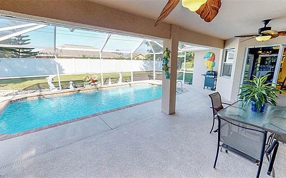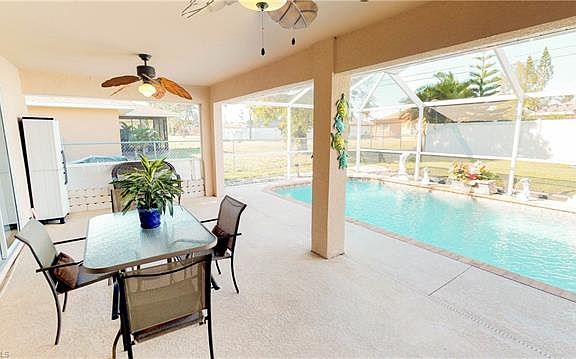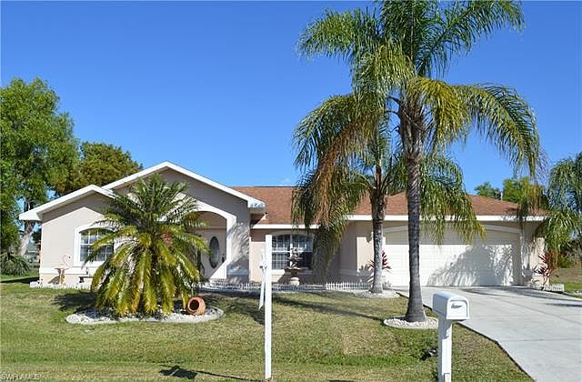 Immaculate 3 bed/2 bath POOL home, lushly landscaped, centrally located in SE Cape Coral. It features living & family rooms, formal & informal dining, spacious kitchen, large pool deck, and a fenced-in yard. Special features include tiles in common areas, carpet in bedrooms, stainless appliances, front load washer & dryer and pool with waterfall feature. Minutes away from Shopping, Dining, Schools, Hospital and Mid-Point bridge.