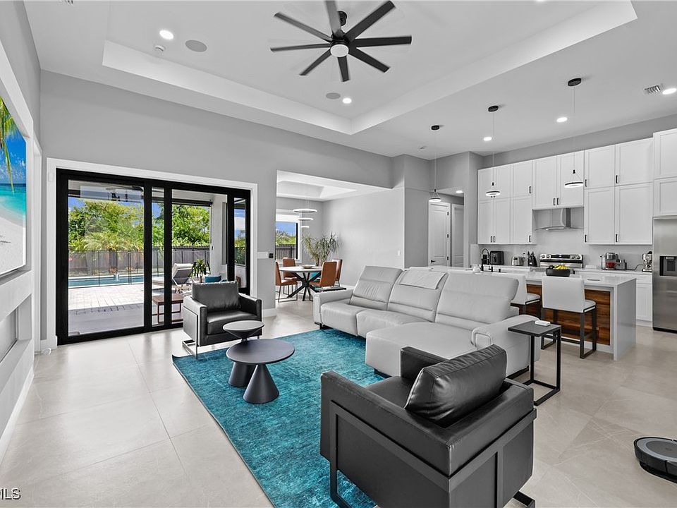 Welcome to your dream home! This stunning custom built 2023 home sits on an oversized triple lot (.38 acres) in one of Cape Coral's most desirable SW neighborhoods offering endless possibilities, including space to build an RV or boat garage with guest quarters. This home is not in a flood zone. Inside, you will find 4 spacious bedrooms, 3 elegant baths, and soaring 13 foot ceilings that enhance the open, airy feel. Each bedroom includes illuminated closets with custom inserts, while the primary and guest suites feature stylish pendant lighting. The primary bath impresses with a dual vanity and a large, beautifully tiled shower with glass enclosure. The chef's kitchen is a showstopper featuring stainless steel appliances, a massive quartz island with pop-up outlets, and abundant counter space ideal for entertaining. Enjoy premium audio throughout the living room, primary suite, and lanai with built-in Bose sound system paired with a Denon amplifier and equalizer. Step outside to your resort-style backyard oasis complete with a 12x30 heated saltwater pool, custom tile, and elegant water features. A removable baby/pet pool fence offers optional safety without compromising style. There is also a convenient pool bath with exterior access and a striking blue-tile outdoor shower. The covered lanai features bar seating, an outdoor kitchen, and breathtaking lake views all surrounded by lush, professional landscaping and captivating night lighting. This home is as durable as it is beautiful, with impact-resistant windows and doors, epoxy garage flooring, whole-home water filtration system, RO drinking system, water softener, and wiring for a generator. Added peace of mind comes from an ADT-monitored security system with cameras in the front and rear of home. Enjoy city water and sewer, underground utilities, and the freedom of no HOA. Close to top-rated restaurants, shopping, and beaches, this home perfectly blends luxury, comfort, and practicality. It is a true MUST SEE!