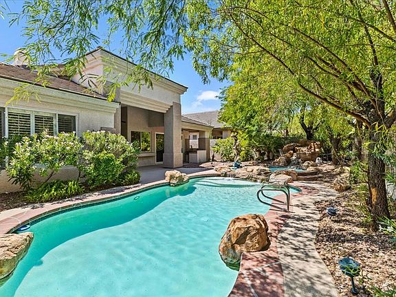 Stunning single story in desirable Canyon Ridge Community. Small gated community of only 65 homes surrounded by luxury properties. Beautiful kitchen with granite counter tops throughout, center island, and commercial grade refrigerator. Two master suites and a generously sized office that could be used as a third bedroom. Built in cabinets in the great room and a cozy fireplace. This home is an entertainers dream with a wet bar, sparkling pool, built in BBQ area, lush landscaping and a covered patio. Tons of extra cabinets for storage. The backyard is a complete oasis with lush landscaping including fruit. Both AC units have been replaced. Please note the lease will end in 8/30/2025 so lease doesn't end in the fall. We are looking for 675 credit and $12k gross income plus one year excellent rent history or home ownership.