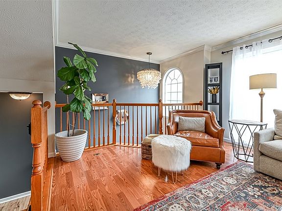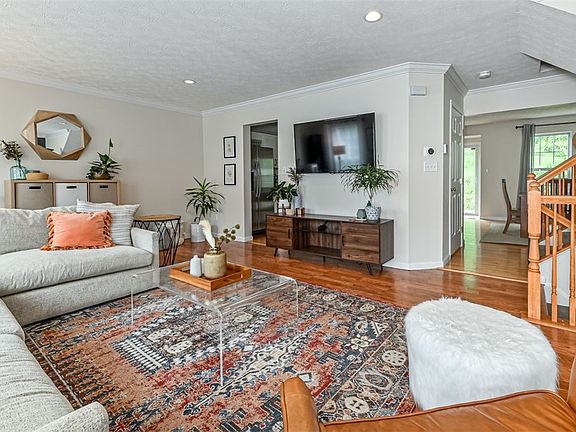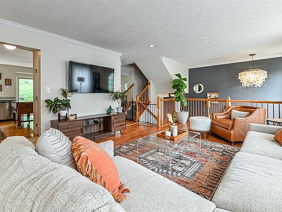 Immaculate Adams Ridge townhome loaded with upgrades. Hardwood flooring. neutral paint colors, upgraded lighting throughout. The gourmet kitchen features new quartzite counters, refinished cabinets, gas stove, stainless steel appliances, custom tile backsplash, pantry, and opens to the deck. Ample natural light. The luxurious primary bedroom has vaulted ceiling, walk-in closet and en-suite bathroom. Updated master bath with new tile flooring and vanity. The laundry is conveniently located on the 2nd floor along with two additional bedrooms. The finished basement can be used for a gym, office or storage space. This townhome boasts a private, level backyard. Community amenities include outdoor pool, clubhouse, tennis & basketball courts, walking trails and much more. Conveniently located within minutes to shopping, dining, major roadways! HOA covers use of access to pool, clubhouse, mowing and mulching, community snow removal, trash pickup.
