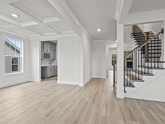 The Stonehaven home is over 3600 square feet of functional living space, perfect for entertaining. Entering the foyer from your covered front porch you have a living room with coffered ceilings for that extra living space or even a home office. To the left of the entry, you have your dining room, also with coffered ceilings, which leads into your butlers pantry that gives you that extra counter space and large pantry. Coming into the open kitchen and great room, you will love the large windows that give so much natural light and the cozy gas fireplace. Features of the kitchen include beautiful staggered grey cabinetry, white Quartz countertops, tile backsplash, center island with farmhouse sink for additional prep space and seating, under cabinet lighting, and gourmet kitchen which includes double wall oven, gas cooktop, and range hood.There is also a bedroom and full bath off the great room that makes a perfect guest suite. Up the Oak wood staircase, you come to the second floor with its loft area, a perfect hang out