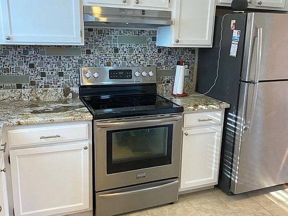 Inside, the dramatic two-story great room showcases smooth cathedral ceilings, crown molding, and custom built-ins. French doors flood the space with natural light and open seamlessly to the patio. Freshly painted in neutral tones, the home is enhanced with wide-plank LVT flooring, updated lighting and fixtures, granite countertops, and a sleek undermount sink. The kitchen shines with stainless steel appliances and a glass tile backsplash, while a sliding barn door conceals the laundry area. Upstairs, the spacious bedroom includes two closets, a walk-in dressing area, and generous storage.
