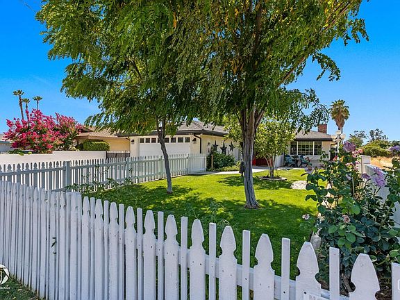 Welcome to this charming approx. 1700 sq. ft. home per seller complete with a white picket fence! The exterior showcases an RV side yard and jacaranda and tulip trees, ensuring irresistible curb appeal. Inside, the entryway opens to the living room with a brick fireplace. Upgrades include laminate flooring, recessed lighting, ceiling fans, granite countertops, crown molding, and custom window treatments. The breakfast nook offers built-in shelves, cabinets, and a coffee bar. The kitchen boasts custom cabinets, some stainless appliances, and an eat-in bar top overlooking the dining room with custom shutters. The spacious primary bedroom features French doors and separate bath boasts dual sinks and a clawfoot tub. The 2nd bed and bath showcasing a tile shower and a pedestal sink complete the layout. Step outside to discover a screened patio with cabinets and a countertop, a partial block wall for privacy, a gas firepit, a chicken coop, and sheds for additional storage. Call today!