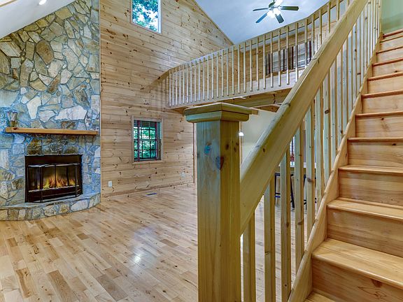 QUALITY BUILT NORTH GA MOUNTAIN CABIN! This cabin located in the paved Martin Heights subdivision, features 3 bedrooms (1 on each level), an open floor plan, great room with stacked stone wood burning fireplace, wood floors, cathedral ceiling with exposed beams, kitchen, large master bedroom with private screened-in balcony, master bathroom with walk-in shower & jetted tub, solid wood doors, spacious covered screened-in & open air decks with nice mountain views, loft sitting area on the upper level, basement with a large living room with gas log stone fireplace, a detached 2 car garage plus an outbuilding, circular driveway and many more quality details.
