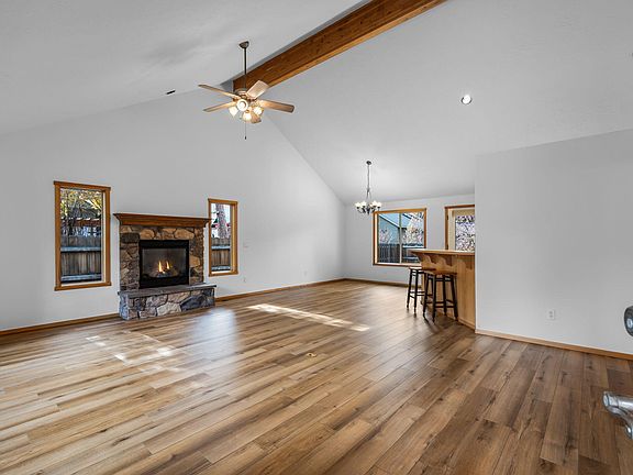 Live on Bend's Westside for under $700K with many upgrades! Located above the Deschutes River on The Ridge in Quail Pine Estates, this ''one-owner'' single level 3-bed, 2 bath home is move-in ready with a brand new roof! New flooring in kitchen, living area, hallway, and guest bath, new interior paint, refinished cabinets in kitchen and primary bath, newer stainless-steel appliances including a Bosch dishwasher and gas stove/oven. Updated water heater, whole-house humidifier, gas hook-up for washer/dryer and a plug-in for a generator and AC! The spacious primary bedroom has a large picture window for natural light and walk-in closet. Large sink in laundry room, high ceilings with exposed wood beam in living room and lodge style gas fireplace. Large concrete patio in backyard with raised garden bed and fully fenced yard. Access the popular Deschutes River Trail just down the street! Close to Pine Ridge Elementary and the Old Mill District. Nicely kept neighborhood with no HOA fee!