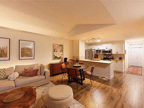 Open-concept living spaceVaulted ceilingsCozy gas fireplaceStainless steel appliancesModern white cabinetryBrand-new fridgeLarge utility closet