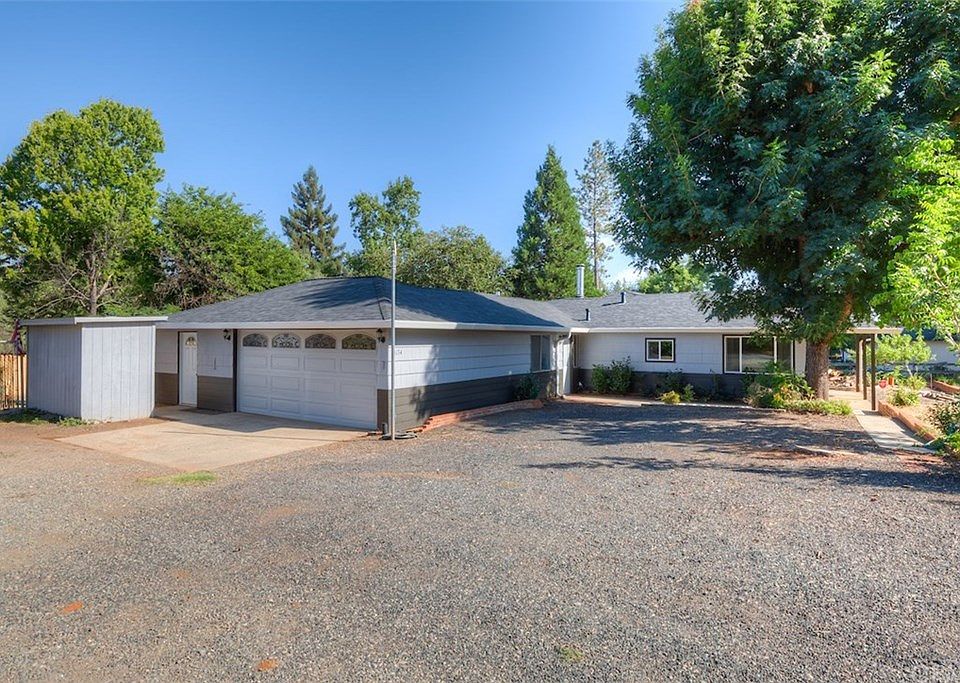 This single level home with an over sized attached garage is ready for a new owner! Located centrally in town, this level lot features ample parking with a circular drive and double gates into the fully fenced backyard. The home has a newer roof, vinyl windows and many more thoughtful touches. Upon entering the home, you'll admire the beautiful laminate floors and flat beamed ceilings. The galley kitchen has newer counters and appliances and leads into a large walk in pantry. The master bedroom is at the back of the home and has a walk in closet, slider to the back deck and a bathroom with walk in shower. Through the french doors off the living room is a bonus space that leads to the backyard and also the large recently insulate mudroom-not included in the county record square feet. In addition to the two car garage, there is ample workshop square footage and a half bath. Be sure to check out this property before it's too late!