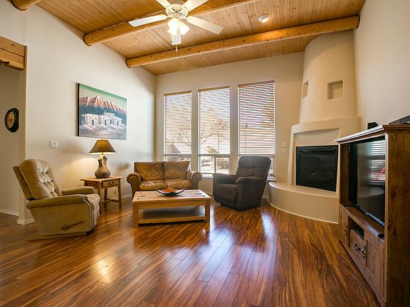 Located in the desirable Enchanted Hills neighborhood, this spacious home situated on a corner lot boasts a bright floor plan with gorgeous southwestern details that make it truly unique. Distinctive living spaces include a chef's kitchen with an eat in bar and breakfast nook, open to formal dining room and cozy family room with beautiful floors, Kiva fireplace, carved beams, tongue and groove ceilings. First floor has a bedroom perfect for in-law quarters with access to a full bath and a formal living room/flex space off the front entryway. Upstairs master bedroom suite has a lovely balcony, bath with two vanities, shower and jacuzzi bath and a walk-in closet. Two additional bedrooms share a full bath. The oversized low maintenance yard has a wonderful covered porch.