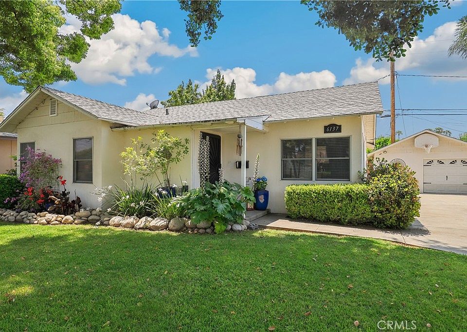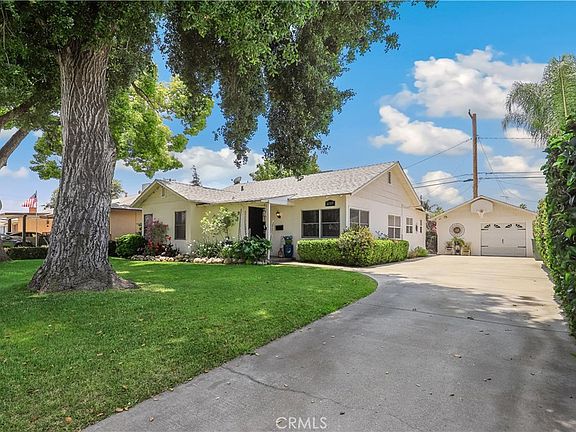This charming home exudes warmth and character from the moment you enter the foyer. Real wood flooring flows throughout, enhancing the home's classic appeal. Spacious open living and dining space off the entry. The fully renovated kitchen features granite counters, a tile backsplash, and a cozy breakfast nook. A laundry room off the kitchen provides convenient access to the backyard. The home offers three well-sized bedrooms, including a spacious primary bedroom with a built-in armoire. The full bathroom includes a built-in linen closet for extra storage. The amazing backyard is a private oasis with a covered patio featuring a ceiling fan, lush green grass, and mature trees and foliage providing lots of privacy. Additional home characteristics: whole house fan, recessed lighting, indoor laundry with folding area and storage, roof only five years old, water heater replaced two years ago and central heating and air. The detached garage offers the opportunity of converting it into an ADU for family or additional income. Conveniently close to shopping, dining and banking you couldn't ask for a better spot to live in. Call and request your private appointment now!
