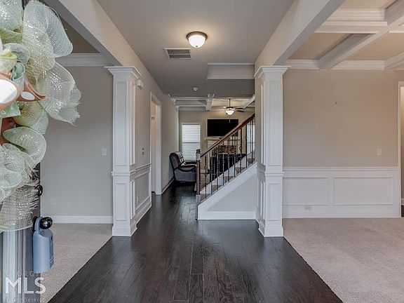 Backyard entertainment is a "10" for this beautiful "end-of-culdesac" home. HUGE backyard patio (partially covered & extends the width of house) & private fenced backyard will knock your socks right off! Custom trim package, coffered & trey ceilings, hardwoods, enormous kitchen w/ island, stainless steel appliances, & granite c'tops. Media room upstairs along w/ gorgeous master suite. Master bath double vanity & huge walk-in closet. Windows tinted for efficiency, active swim/tennis resort-style community, walking distance to Lake Lanier & minutes to shopping.